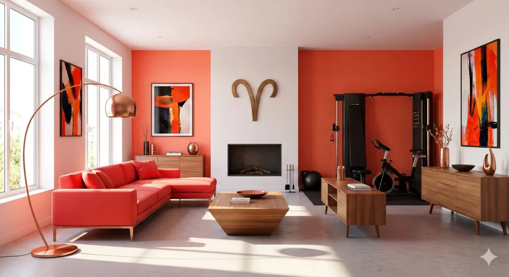 - Odak Noktası: Evin girişinde veya oturma odasında dikkat çekici, büyük bir sanat eseri veya tasarım bir lamba bulunması Koç burcunun lider ruhunu tatmin eder.